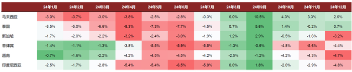 注:图中数据为东南亚六国期末货币汇率与2023年12月31日相比变化幅度 资料来源:Haver Analytics,中金公司研究部