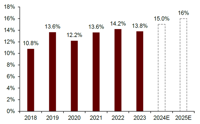 ► 保持宽松的货币政策:截至2024年12月末,越南已连续19个月将政策利率维持在4.5%的较低水平(2000-2024年的中枢为6.7%,并且近5年峰值为4Q22至1Q23的6.0%)。2018-2025年期间,越南预计存量信贷增长有望维持在13.6%的平均增长水平。我们认为越南存量信贷增长在2025年及以后有望保持双位数的增长,来助力越南经济发展。根据越南央行计划,2024年全年的存量信贷增长有望达到近15%,并为2025年设定了16%以上的信贷增长目标。我们认为越南信贷增长或持续聚焦于制成品出口相关企业。