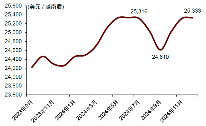 ► 汇率贬值压力加大:由于美联储政策利率居高不下,我们认为2025年上半年,越南盾及东南亚其他新兴市场的汇率贬值压力或居高不下,可能于2025年下半年才出现修复。