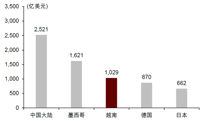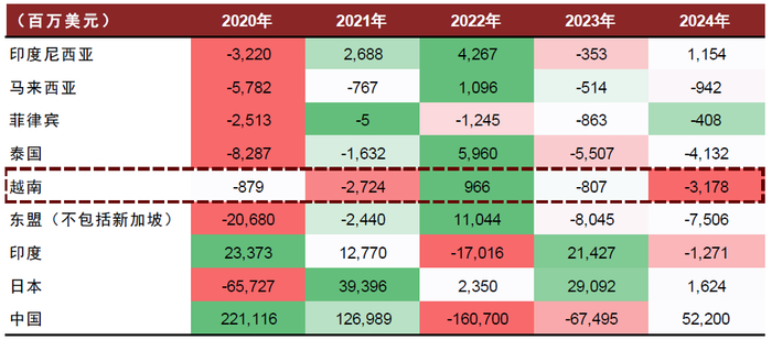 ► 贸易摩擦加剧:2023年以来,越南对美国的贸易顺差持续加大至1,000亿美元以上,成为美国第三大的贸易赤字来源国。我们认为2025年美国在特朗普总统2.0时代下的政策主张或将聚焦于限制贸易赤字扩张,而越南作为较大的赤字来源国或面临部分品类的关税制裁。