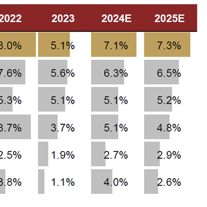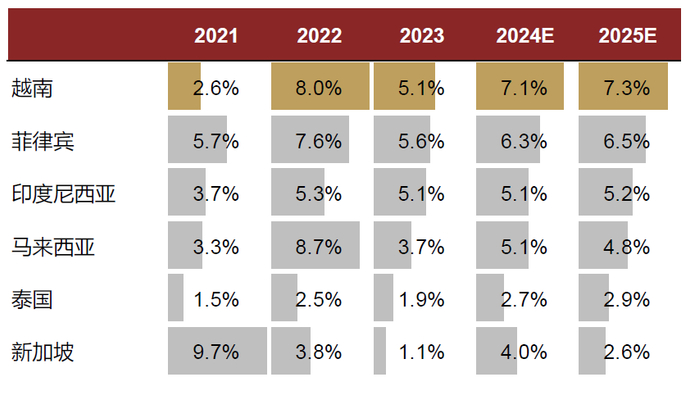 根据越南统计总局2025年1月6日公布的初步统计(preliminary data),越南2024年名义GDP为4,573亿美元,实际增长率为7.1%(超过国会计划的6.0-6.5%GDP增速),经济增速在东南亚区域排名第一。展望2025年,我们认为外贸、外商投资和外来游客驱动的增长作用或放缓,而房地产复苏、基础设施建设、数字经济、内需消费等增量因子或开始发力。