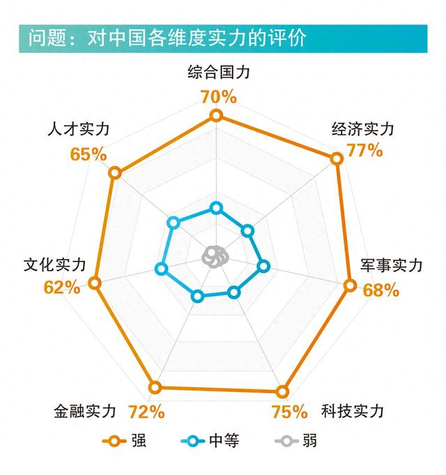 调查数据显示,中国的综合国力及各项实力被国外受访民众普遍评价为“强”。经济实力强获认可比例最高,达77%;其次为科技实力(75%)和金融实力(72%)。年轻群体对中国科技实力的评价更高。非洲国家、金砖国家、中东国家、发展中国家有超过七成民众认为中国综合国力强;该比例在东盟国家和欧洲国家超过六成,在发达国家超过半数。