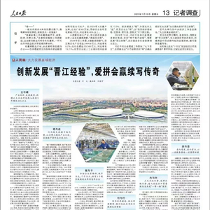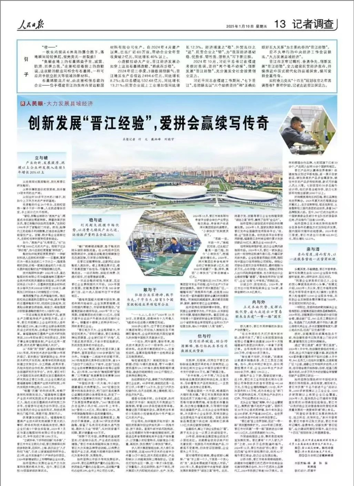 今天,《人民日报》整版刊发《创新发展“晋江经验”,爱拼会赢续写传奇》,报道晋江全力建设民营经济强市,持续推进中国式现代化的县域探索,展现经济增速之“稳”、外贸出口之“进”、民营企业之“韧”,为“我国经济基础稳、优势多、韧性强、潜能大”写下新注脚。