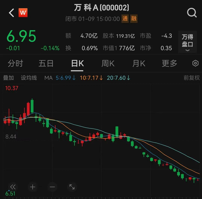 今日,万科A股价平收,截至收盘,万科报6.96元/股,总市值为830.38亿元。