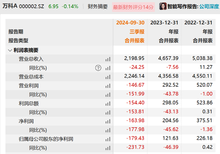 万科的经营状况也从去年开始下滑。去年前三季度,万科实现营业收入约为2198.95亿元,同比下降24.25%;归母净亏损179.4亿元,同比下降231.73%;期内公司经营活动产生的现金净流出48.48亿元,2023年同期为流入2.35亿元。