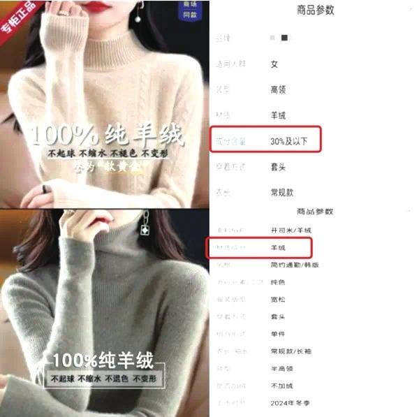 但对于普通消费者来说,买到合格的羊绒衫似乎并不容易。尤其是在某些电商平台上,部分售价百元以下、标注“100%纯羊绒”的产品存在成分虚标、乱标的问题。