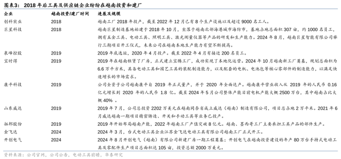2018年4月,美国贸易代表办公室发布关于根据301法案确定行动的征求意见的通知将对中国输美的部分商品加征10%-25%的关税,由此开始了持续至今中美贸易摩擦,导致行业内企业较为被动的开始全球产业链和供应链拓展和整合。全球电动工具龙头创科实业Techtronic Industries率先开启了出海东南亚的历程,并于2018年将越南工厂投运,截至2022年12月公司在越南已有超过9000名工人。第一轮贸易摩擦开启后,行业内其他不同规模的出口型企业也纷纷出海东南亚,其中越南由于其人力成本优势和关税优势,是手工具与电动工具企业前往较多的目的地之一。