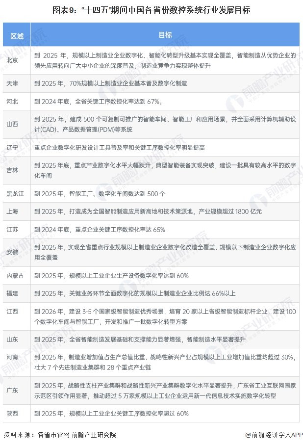 “十四五”期间,部分区域对数控系统提出发展目标,尤其对工业企业的关键工序数控化率提出明确要求,如河北提出到2024年底,全省关键工序数控化率达到67%,江苏提出到2024年底,重点企业关键工序数控化率达65%。