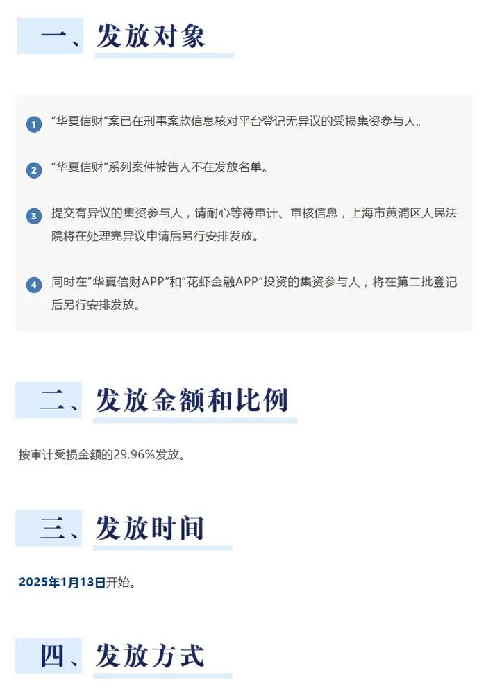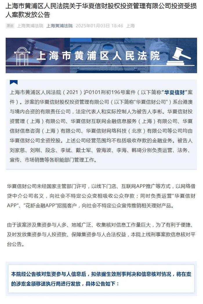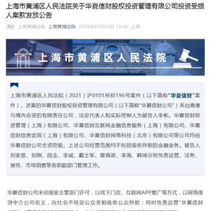 近日,上海市黄浦区人民法院发布关于华夏信财股权投资管理有限公司投资受损人案款发放公告,将按审计受损金额的29.96%进行发放。