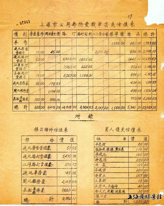 《上海市公用局所受战事损失估值表》(上海市档案馆藏)