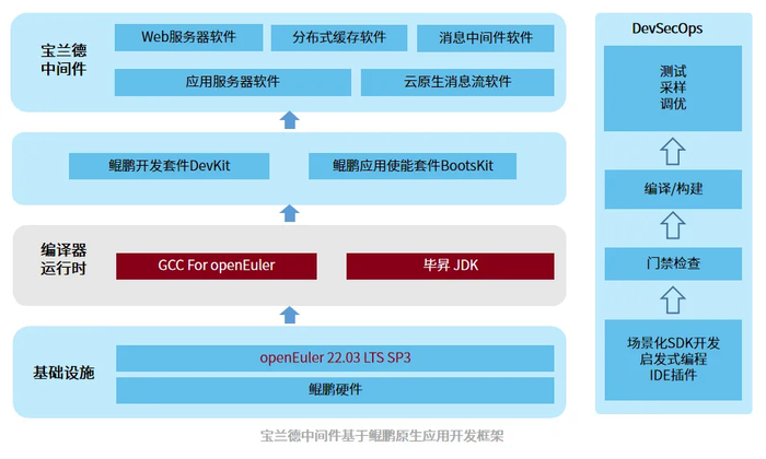 基于以上考虑,宝兰德携手鲲鹏,共同推进金融核心应用的自主创新转型建设,基于鲲鹏软硬件平台推进原生开发的最佳实践。今年6月,宝兰德正式开启与鲲鹏原生应用开发合作,基于鲲鹏硬件底座、openEuler开源操作系统、开发套件Kunpeng DevKit、应用使能套件Kunpeng BoostKit开展面向金融、政务、电信、能源、交通、医疗、教育等重点行业场景的软硬件原生应用开发,打造基于鲲鹏的宝兰德解决方案,并持续发布性能更优的鲲鹏商用软件版本,构建高效、稳定、自主创新的数据底座。目前宝兰德应用服务器软件、分布式缓存软件 、云原生消息流软件、消息中间件软件、以及Web服务器软件五款产品,已基于鲲鹏原生开发进行技术改造。