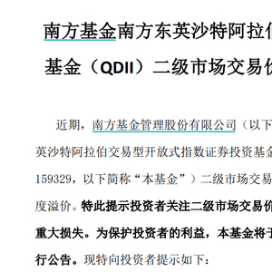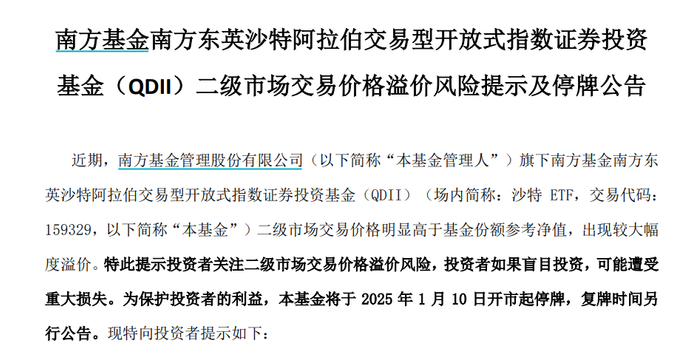 1月10日,南方基金管理股份有限公司发布公告称,南方基金管理股份有限公司旗下南方基金南方东英沙特阿拉伯交易型开放式指数证券投资基金(QDII)(场内简称:沙特 ETF,交易代码: 159329)二级市场交易价格明显高于基金份额参考净值,出现较大幅度溢价。特此提示投资者关注二级市场交易价格溢价风险,投资者如果盲目投资,可能遭受重大损失。为保护投资者的利益,本基金将于2025年1月10日开市起停牌,复牌时间另行公告。