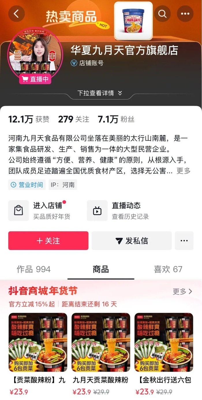 2024年,重点发力抖音电商的九月天交出了更加亮眼的“成绩单”:“爆品”贡菜酸辣粉多次跻身抖音酸辣粉类目前三名,月销售额最高超一千万元。在抖音“大放异彩”的九月天是如何凭借一碗粉,获得消费者认可的呢?