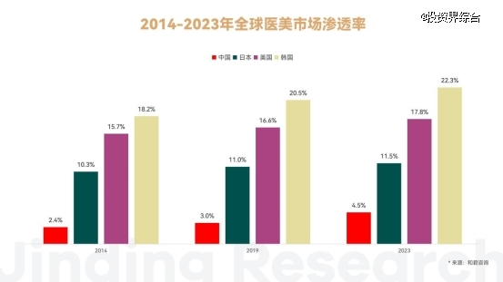 从渗透率上来看,与美国、韩国等国家相比,我国的医美市场渗透率尚有至少2-5倍的增长潜力,目前仅处于4-5%的水平。