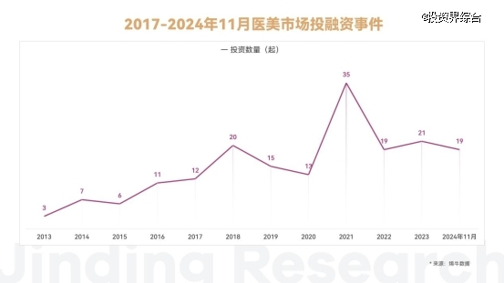 2013至2024年11月,医美行业共发生181起投融资事件。2021年是资本市场的活跃高峰,彼时国家对医美行业重视程度上升,加强对行业的监管,同时疫情后消费市场普遍复苏,作为拥有消费和医疗双重属性的医美行业受到资本市场关注,成为热门赛道之一。