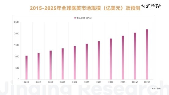2015-2025年全球医美市场规模稳步增长,年复合增长率约7%。2023年,全球市场规模达1907亿美元。未来,全球医美市场将保持稳步增长态势,2025年市场规模将达到2183亿美元。