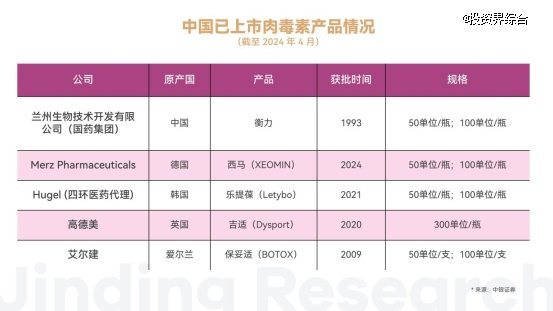 中国将A型肉毒素及其制剂列入毒性药品管理,因此肉毒素作为处方及麻药类药品,相关产品的生产、经营和使用受到严格监管,从立项到获批需八年或更长时间。截至2024年4月,中国市场仅有5款肉毒素产品获批,其中3种均为2020年及以后获批,上市时间不足四年。