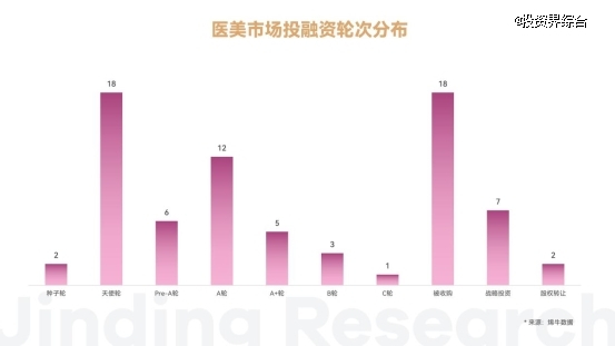从总体情况来看,医美市场发展仍处早期阶段,A轮及以前融资企业较多。值得一提的是,近几年医美行业中产生的收购动作较多,共有18起。从收购动作中可以看出,市场正进入资源整合阶段,产业链企业正通过并购上下游或不同产品线的企业进行更深度的产业布局,增强竞争力。同时,较多其他行业企业也正通过并购跨界入局医美行业,例如婴幼儿服饰及日用品研销商金发拉比、高端时尚品牌集团公司朗姿股份在近期都完成了对多个整形美容服务机构的收购。