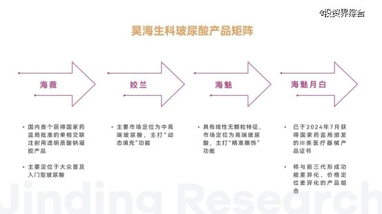 在玻尿酸领域,昊海生科先后推出了四代产品,分别是“海薇”“姣兰”“海魅”“海魅月白”,形成功能差异化、价格定位差异化的产品组合,能够满足日益多元化的医美市场需求。2024年11月22日,第四代产品“海魅月白”正式上市。