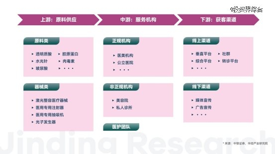 针对医美项目的不同种类,对应不同的原材料,原料类项目上游原料包括透明质酸、胶原蛋白等;器械类上游原材料包括激光整容医疗器械等。产业链中游为服务机构,正规机构包括医美机构和公立医院,非正规机构包括美容院、私人诊所等。