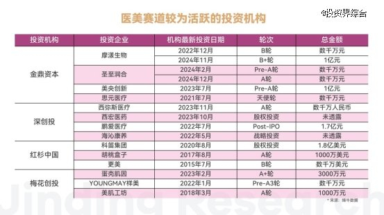 机构端,金鼎资本、深创投、红杉中国等最为活跃,金鼎资本将医美作为重点方向,共参与了对4家企业的投资,其中2起都发生于2024年。