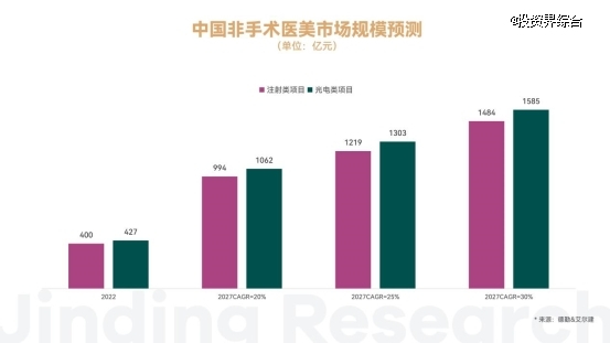 根据德勤&艾尔建《中国医美行业2023年度洞悉报告》,在2022年非手术医美市场中,光电项目占比为47%,市场规模约为427亿元,预期在2022年-2027年保持20%-30%的年均复合增速。