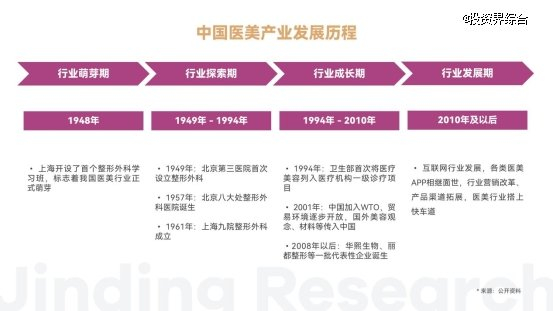 1994年我国政府正式承认医疗美容行业,时隔八年出台相关法律、政策,标志行业开始规范化发展。2008年以后,随着国际合作增多以及国家政策的支持,中国医美快速发展,涌现了华熙生物、丽都整形等一批代表性企业。2010年互联网行业发展方兴未艾,各类医美APP相继面世,行业营销改革、产品渠道拓展,医美行业搭上快车道。