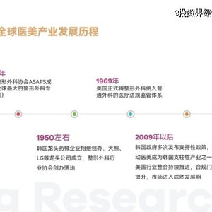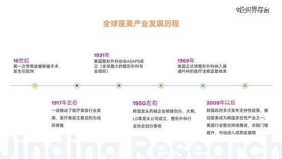 16世纪左右,医美诞生,主要为身体存在先天后天缺陷的患者服务;1917年左右,一战推动了医疗美容行业发展,因战争创伤带来整形和修复需求,治病救人;1931年美国整形外科协会ASAPS(全球*的整形外科专业组织)成立,同时美国《整形外科杂志》等权威期刊、整形外科基金会等官方基金会相继创办,推动了全球医美行业规范化发展。