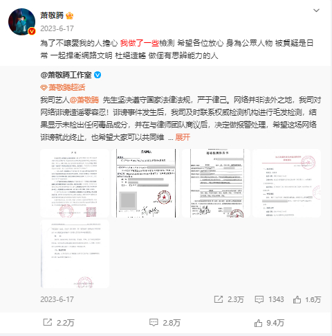 2023年6月17日,萧敬腾工作室发出毛发检测报告证明未吸毒,表示已报警处理,并在警方要求下进行毒检,结果显示为阴性。