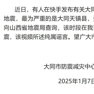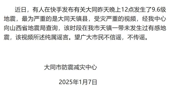 1月7日晚,大同市防震减灾中心对上述消息进行辟谣,消息称,“近日,有人在快手发布有关大同昨天晚上12点发生了9.6级地震,最为严重的是大同天镇县,受灾严重的视频,经我中心向山西省地震局查询,该时段在我市天镇一带未发生过有感地震,该视频所述纯属谣言。望广大市民不信谣,不传谣。”