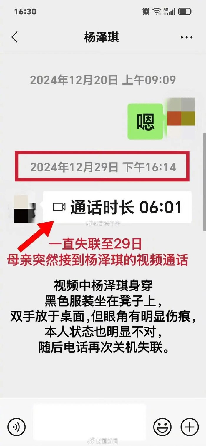 12月29日杨泽琪与母亲打了视频通话报平安,视频中杨泽琪眼角有明显伤痕,本人状态也明显不对,随后电话再次关机失联。