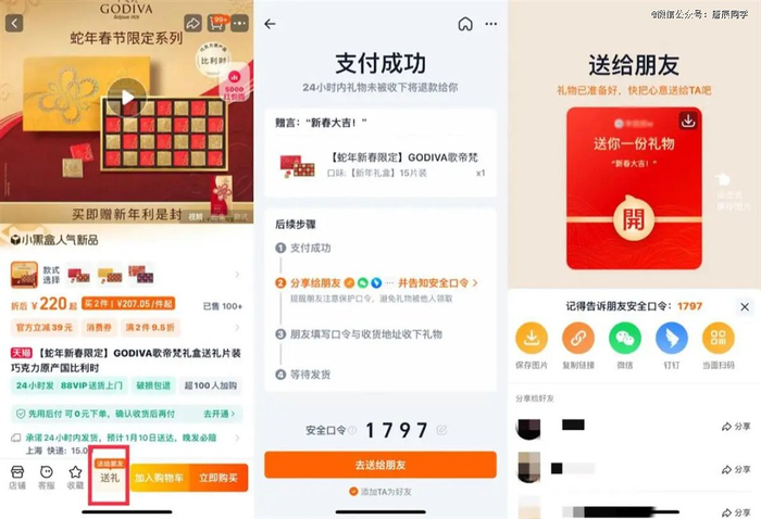 根据个人体验,在点击商品页面底部的“送礼”按钮,下单购买礼物后,可自定义四位数的安全口令。随后就可以将安全口令和淘口令发送给收礼方,即为送出礼物。礼物时效为24小时,收礼人在这个期间复制淘口令,在淘宝App内打开,填写收货地址(可选择默认地址),并输入安全口令,即可收下礼物。