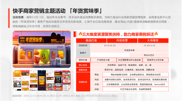 为助力食品行业商家把握消费趋势,由快手商家业务中心发起的「年货赏味季」聚焦产地风味推荐及年货抢先购场景,汇聚平台亿级流量资源,整合商品/内容/直播资源赋能趋势类目商家,帮助商家抢占年货市场,实现生意跃迁。许多优秀的商家通过精细化的运营,实现了单品的打爆、大场破峰及生意跃迁。