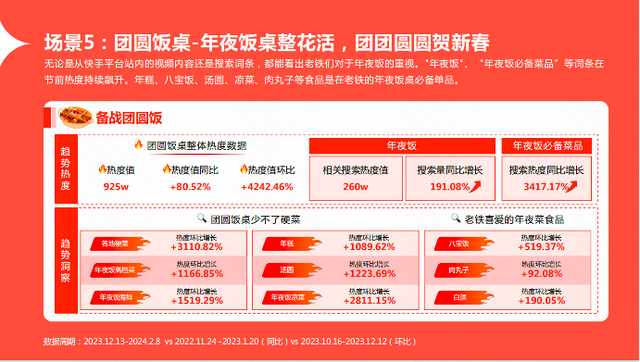 结合用户在快手平台上的食品内容,搜索偏好及消费数据,根据近年快手平台春节前站内内容、搜索及消费数据,报告总计并提炼出五大核心年货赏味趋势,分别是「寻觅年味」「品质追求」「礼赠美味」「放纵吃喝」及「团圆饭桌」。