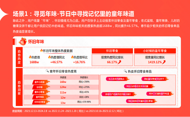 除此之外,用户渴望“年味”,怀旧情绪尤为凸显。用户在快手上主动搜索怀旧零食及童年零食,老式蛋糕、童年辣条,儿时的糖果及饼干都让用户找回记忆中的味道。怀旧年味相关的搜索热度超1688w,同比提升46.57%。春节前夕相关的怀旧零食单品热度值显著增长。