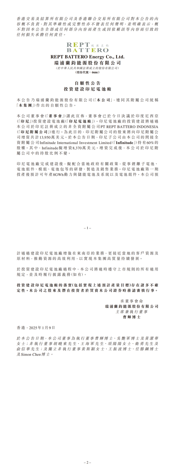 储能与电力市场获悉,1月9日,瑞浦兰钧(股票代码:00666 )发布公告,董事会已决议于印度尼西亚投资建设电池厂。