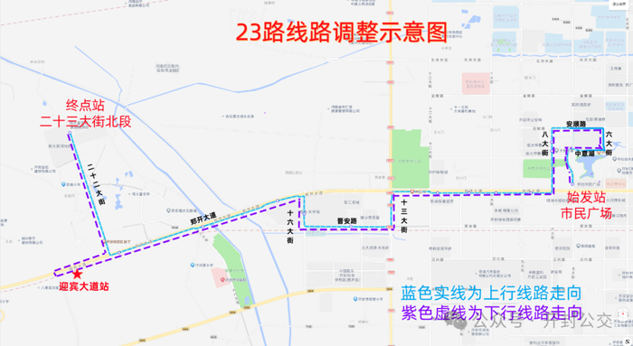 二十二大街北段-迎宾大道-郑开大道·二十二大街-郑开大道·十八大街-郑开大道·十六大街-运粮河站-晋安路·十四大街-自由贸易区-郑开大道·十一大街-郑开大道·十大街-郑开大道·九大街-八大街·安康路-开封市城乡一体化示范区管委会-中意湖健康主题公园-市民广场公交场站。