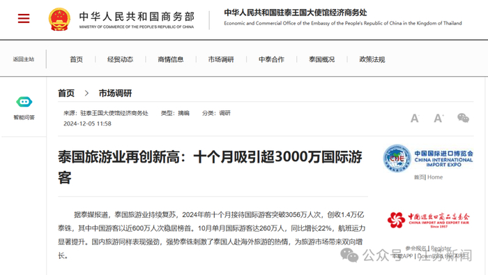 驻泰王国大使馆经济商务处消息,据泰媒报道,2024年泰国旅游业持续复苏,2024年前十个月接待国际游客突破3056万人次,创收1.4万亿泰铢,其中中国游客以近600万人次稳居榜首。