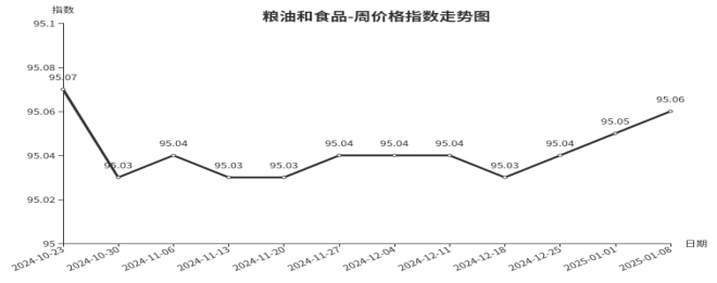 本周,粮油和食品类周价格指数收于95.06点,环比上涨0.01点。从二级分类看,干果类和调味品类分别上涨0.27点和0.10点,茶叶类下跌0.08点,粮油类和副食类价格指数与上期持平。