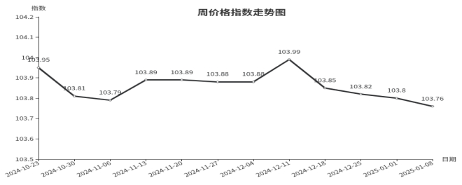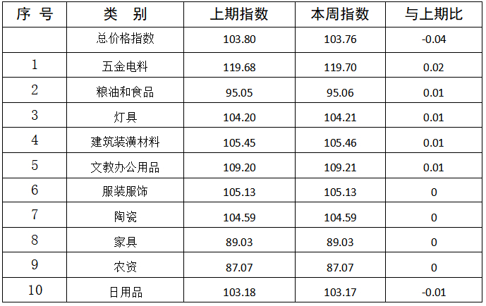 据临沂商城价格指数信息系统监测,本周临沂商城周价格总指数为103.76点,环比下跌0.04点,跌幅0.04%。