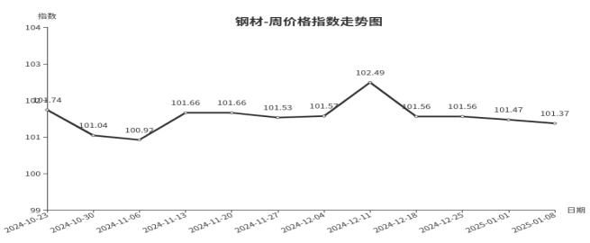 本周,钢材类周价格指数收于101.37点,环比下跌0.10点,跌幅0.10%。从盘面看,三级分类全部下跌,其中板材类、管材类分别下跌0.14点和0.12点,成拉动指数下跌主力,型材类、建筑钢材类指数微幅下跌,指数分别下跌0.07点和0.03点。