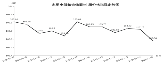 本周家用电器和音像器材类周价格指数继续下跌且跌幅增大。元旦过后,家电市场整体交易清淡,展示柜、冰箱、吸尘器、空气净化器等需求不足,市场销售量减少,价格随市走低。音像器材中的电视机、厨房电器中的面包机等零售居多,价格略有上涨。今年冬天与去年相比温度偏高,热水器、电热器销量不佳,行情偏淡。从市场具体规格品看,松下B20SP2-S冰箱价格2010.00元/台,下跌1.95%;五箭牌展示柜价格2900.00元/台,下跌3.01%;飞利浦吸尘器fc8082吸尘器价格275.00元/台,下跌0.52%。