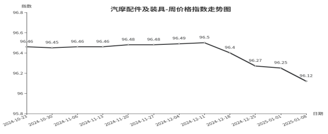 本周,汽摩配件及装具类周价格指数收于96.12点,环比下跌0.13点,跌幅0.13%。从盘面看,二级分类中汽车配件价格继续走低,环比下跌0.18点,其中发动机系统配件、车身系统配件、电气设备配件分别下跌0.35、0.14、0.05点;底盘系统配件回升0.12点。