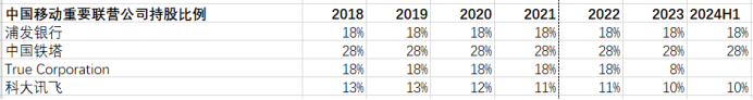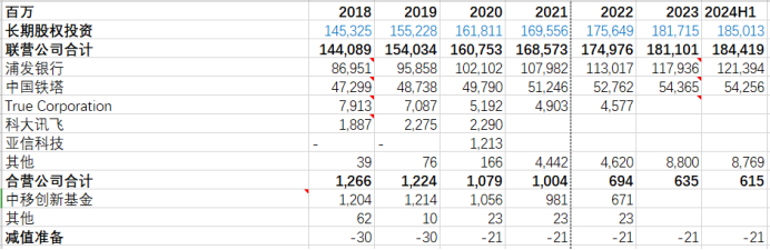 多年多移动的长期股权投资主要的联营公司包括浦发银行、中国铁塔、True Corporation、科大讯飞,移动持有的浦发银行和中国铁塔的账面价值占总长期股权投资的90%以上,而合营公司主要就一个中移创新基金。