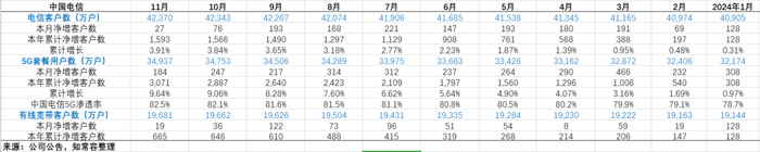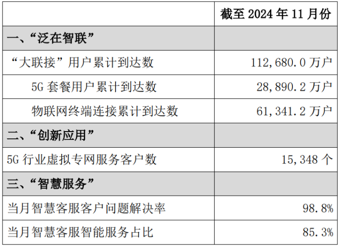 中国电信2024年11月客户数据,移动用户数42,370万户,本月净增客户数27万户,本年累计净增客户数1,593万户,年累计增长3.91%;其中5G套餐客户数34,937万户,当月净增184万户,当年累计净增3,071万户,年累计增长9.64%;