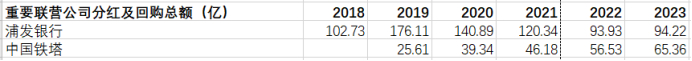 将目前持有浦发银行和中国铁塔股份比例市值、2018-2023年历年来按照权益法移动享有两家公司分红加总,减去成本(即2018年移动持有两家公司的长期股权投资账面价值,实际成本可能比账面价值更低,将导致我们计算产生误差),简单计算收益。