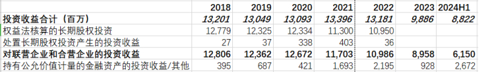联营、合营的主要公司没有太大变动,所以我们可以简单计算一下2018-2023年长期股权投资收益率为47.81%(对联营企业和合营企业的投资收益2018-2023年总计694.87亿/2018年长期股权投资账面价值),年复合8%,看起来收益率还不错。