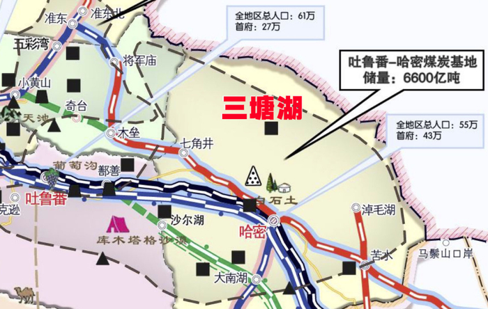 三塘湖矿区:位于巴里坤县北部约 80 公里处的三塘湖盆地,矿区面积 2310 平方公里,探求千米以浅资源量 371.12 亿吨,可供露天开采资 源量 5 亿吨。矿区面积广阔,其中特定区域如石头梅二号井田南区勘探项目面积就达17.04平方千米. 三塘湖煤炭资源项目具备丰富的资源量,主要为长焰煤,资源量达20.93亿吨,是优良的动力用煤和煤化工用煤。主要分布的煤矿有,新疆能源石头梅一号矿、哈密鑫源矿业煤矿、保利别斯库都克煤矿和黑眼泉煤矿。