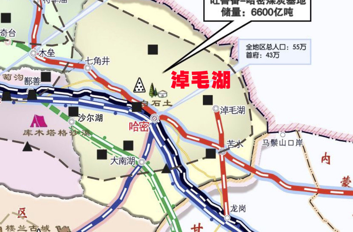 淖毛湖矿区:淖毛湖矿区位于新疆哈密地区伊吾县城北偏东的北角上,距离县城约73公里,北面、东面均与蒙古国交界,位于伊吾县北部约 70 公里处淖毛湖镇, 矿区面积 2166 平方公里, 探求千米以浅资源量 235.81 亿吨,可供露天开采资源量 32 亿 吨。