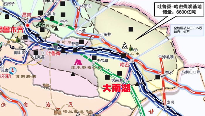 2.大南湖煤矿区:位于哈密市南部 80 公里, 矿区面积 1100 平方公里, 探求千米以浅资源量 709 亿吨,可供露天开采资源量 29 亿吨,该矿区依托于国家能源电厂,建成煤电一体化项目,矿区煤炭从过皮带传送的方式,直接输送到电厂,只有少量对外销售。